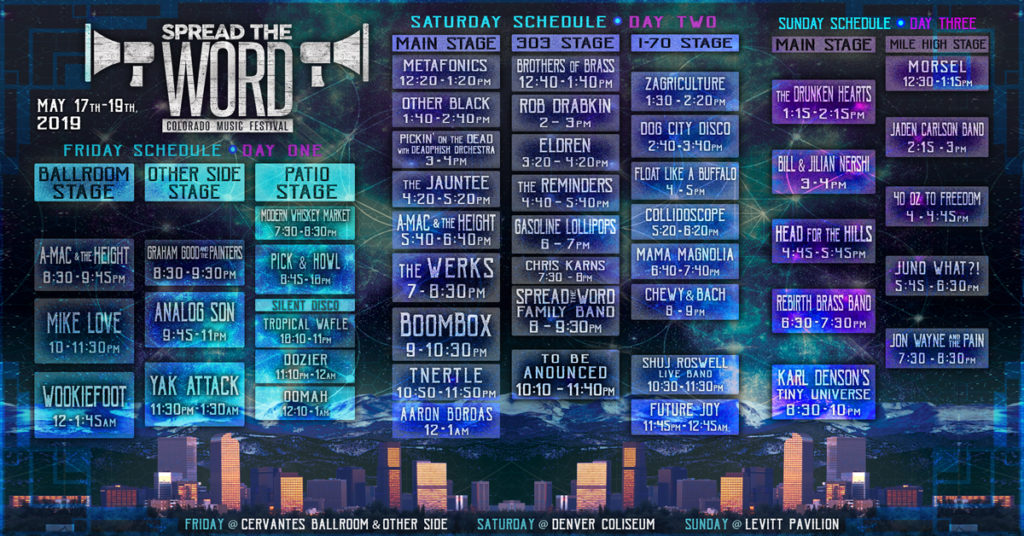 Posted onCheck out the layout for Day Two of Spread The Word Music Festival 2019 outside Denver Coliseum! π 3 stages, live painter village, vendors, food trucks, yard games, coverage via the I-70 overpass plus some exciting surprisesπ πΆ BoomBox, Magic Beans, The Werks, Spread The Word Family Band (w/ members of SunSquabi, SCI, ect.), A-Mac & The Height + many more! RSVP: https://www.facebook.com/events/512986666195272/ Single Day […]